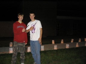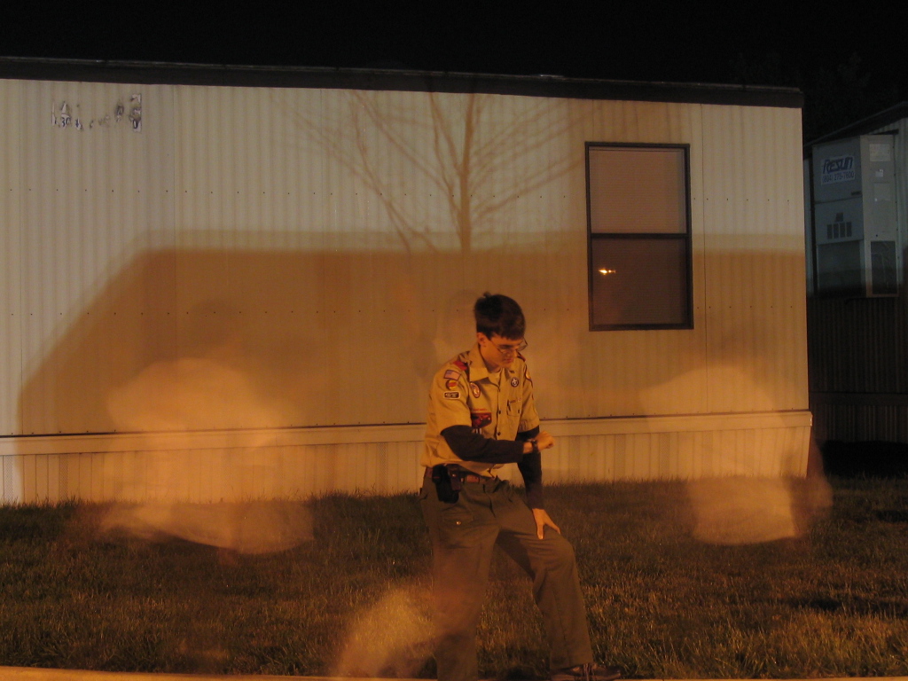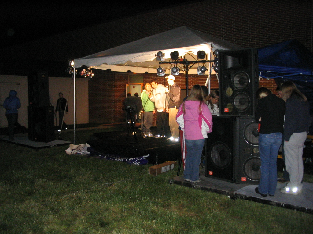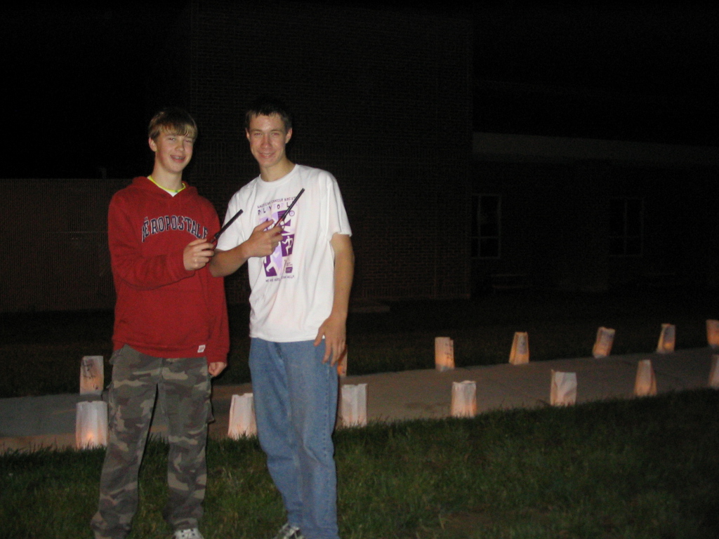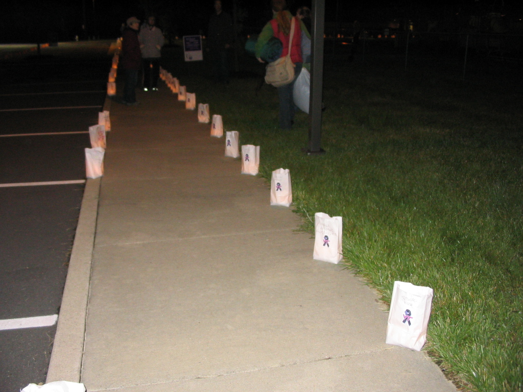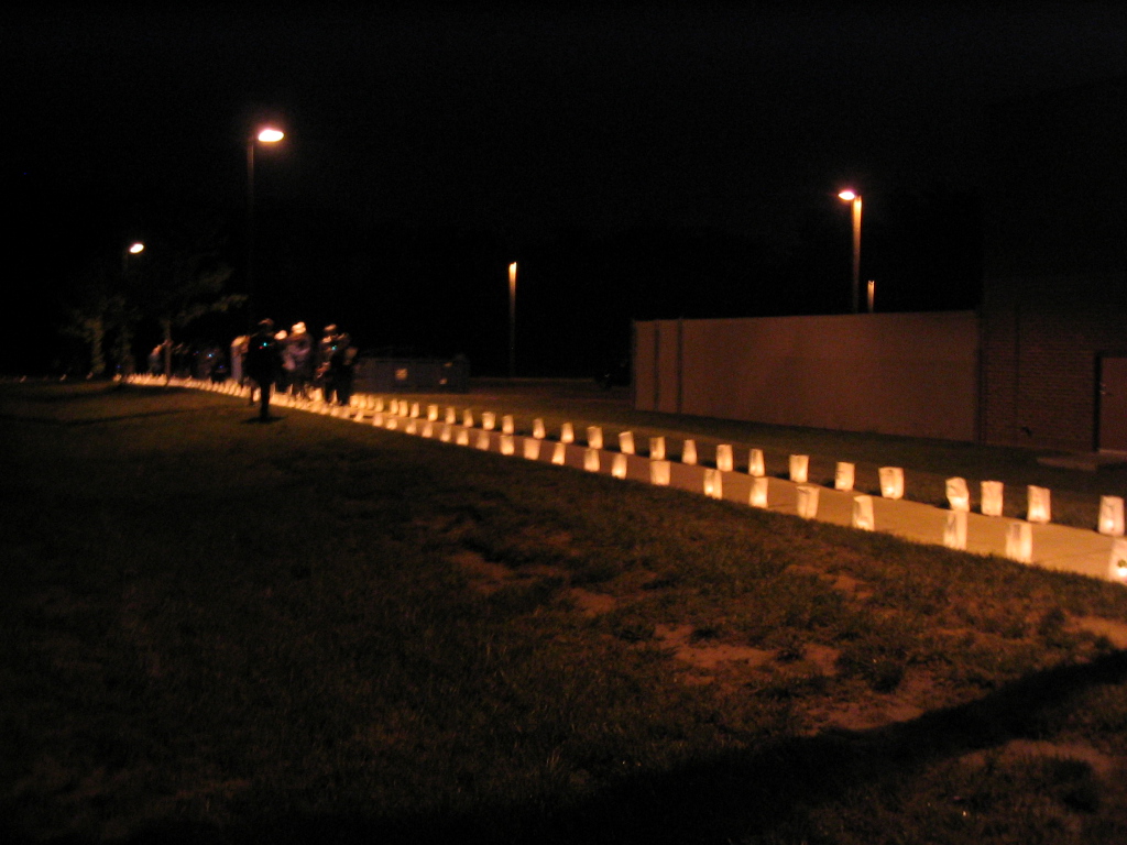 Night falls on the walkers. Ow. You can see all the luminaria that our people placed around the track. The track was supposed to be off in a field at the church where my troop meets, but due to squishiness, we had to move to this sidewalk by the kiddie playground. | |