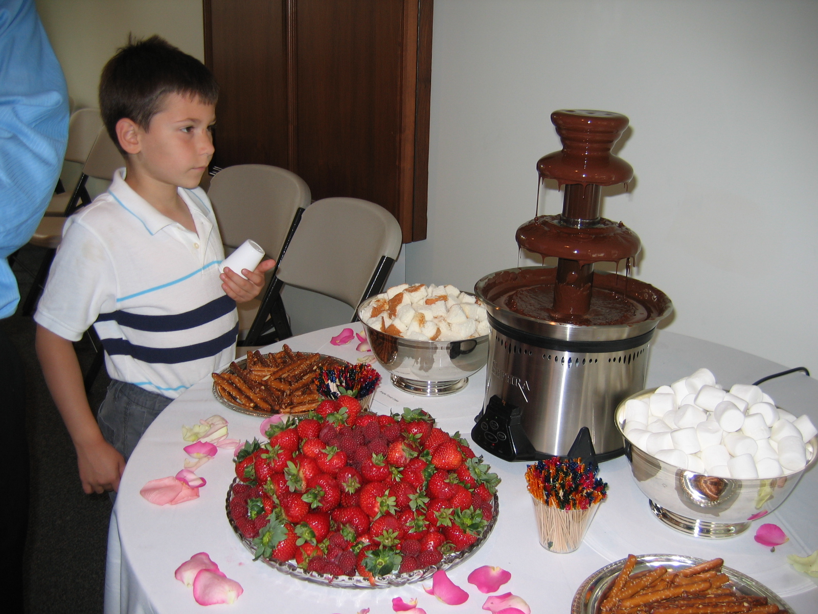 And the fondue fountain. It wasn't until we were putting it away that we actually took the time to read the directions and figured out that there were air bubbles stuck in the chocolate's Archimedes' screw, preventing it from flowing properly. Oh well.